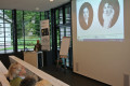 Op de foto een kijkje in het auditorium met Henk Schaftenaar achter het katheder. Hij hield op de hem bekende wijze een boeiende voordracht over de geschiedenis van Oud-Bussem, terwijl vanaf het diascherm het echtpaar van Rossum-Hugues aandachtig toekijkt.